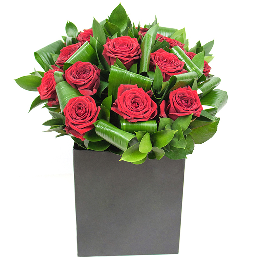 Delight in the captivating allure of our Charming Red Rose Ensemble, a beautiful combination of passionate red roses, vibrant aspidistra leaves, and graceful ruscus. Designed to infuse elegance and warmth into any environment.